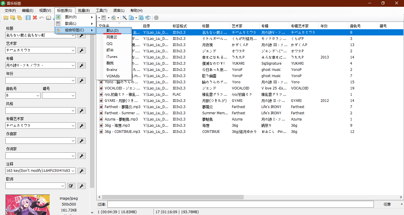 接着,就需要你耐心地查看每首歌的元数据(善用方向键),检查是否有匹配错误的歌曲,并在 标签源-组合标签 处手动搜索,选择正确的元数据,如下图所示: